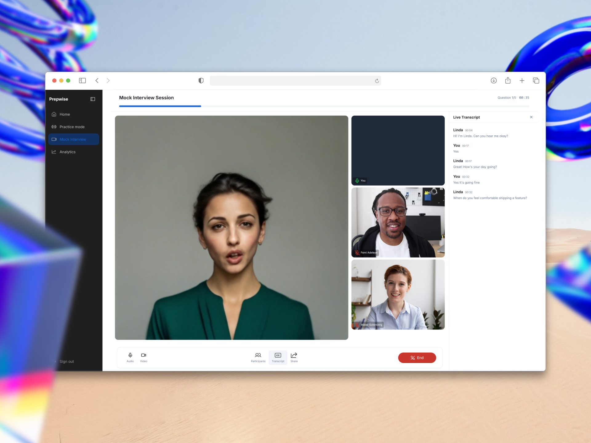A real-time AI interview coaching platform with a lip-synced video avatar, streaming voice feedback in under 500ms, and multi-dimensional answer evaluation — built in 8 weeks as part of a Collabsprint team.